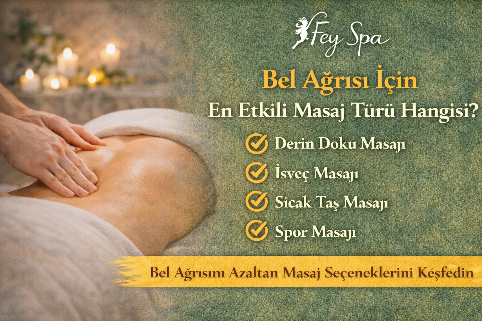Bel ağrısı için en etkili masaj türü hangisi sorusunun yanıtı, ağrının nedenine ve şiddetine bağlıdır. Derin doku masajı, İsveç masajı, sıcak taş masajı ve spor masajı bel bölgesindeki kas gerginliğini azaltmada oldukça etkili olabilir.